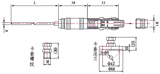 ◆型號為WR①KG②-31S/⑥⑦⑧-⑨/⑩/?/?/?/?的帶補強管式熱電偶可以與活動卡套螺紋、固定卡套螺紋和固定卡套法蘭組合成如下圖所示的鎧裝熱電偶: